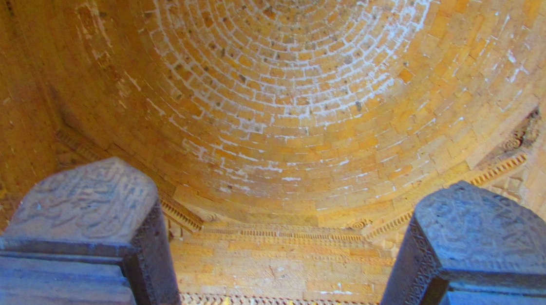 In their over-all plan, the tombs are cubical each having a globular dome plastered with lime. The most fascinating features of the ornamental setting of these tombs consist in the exquisite grace of carved yellow sand stone treatment of their pillars, doors, facades, ceilings and tombstones. The foundation and their plinths, without exception, are laid in stone.